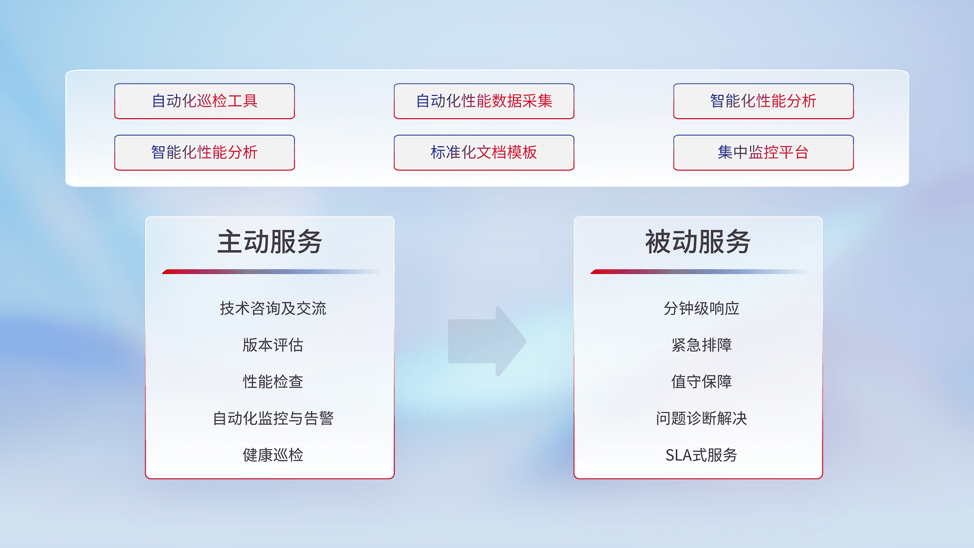 智能化工具和标准化文档,,,保障服务质量,,,提供主动服务(包含技术咨询、、、、版本评估、、、、性能检查、、自动化监控与告警、、、健康巡检)和被动服务包含(分钟级响应、、、紧急排障、、、、值守保障、、问题诊断解决、、、SLA服务)。。